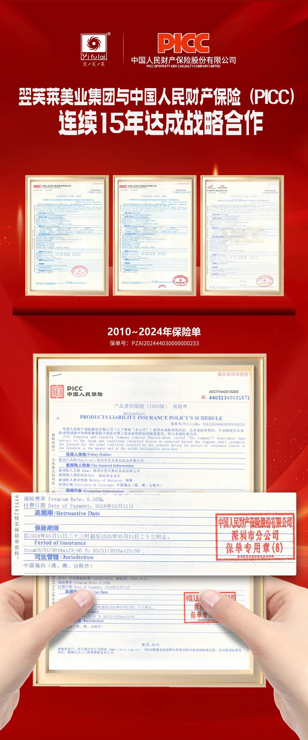2024年3月31日,翌芙萊美業(yè)集團(tuán)與中國(guó)人民財(cái)產(chǎn)保險(xiǎn)公司(PICC)再度達(dá)成戰(zhàn)略合作,簽訂產(chǎn)品保險(xiǎn)續(xù)保協(xié)議,迄今為止,翌芙萊美業(yè)集團(tuán)已經(jīng)連續(xù)15年受到中國(guó)人民財(cái)產(chǎn)保險(xiǎn)PICC的品質(zhì)鑒定與質(zhì)量保障。